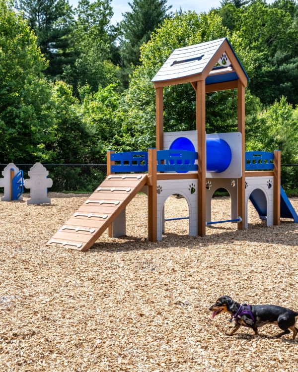A dog park with jumps and toys for your pooch to play, plus a dog wash room/pet spa to clean him up.